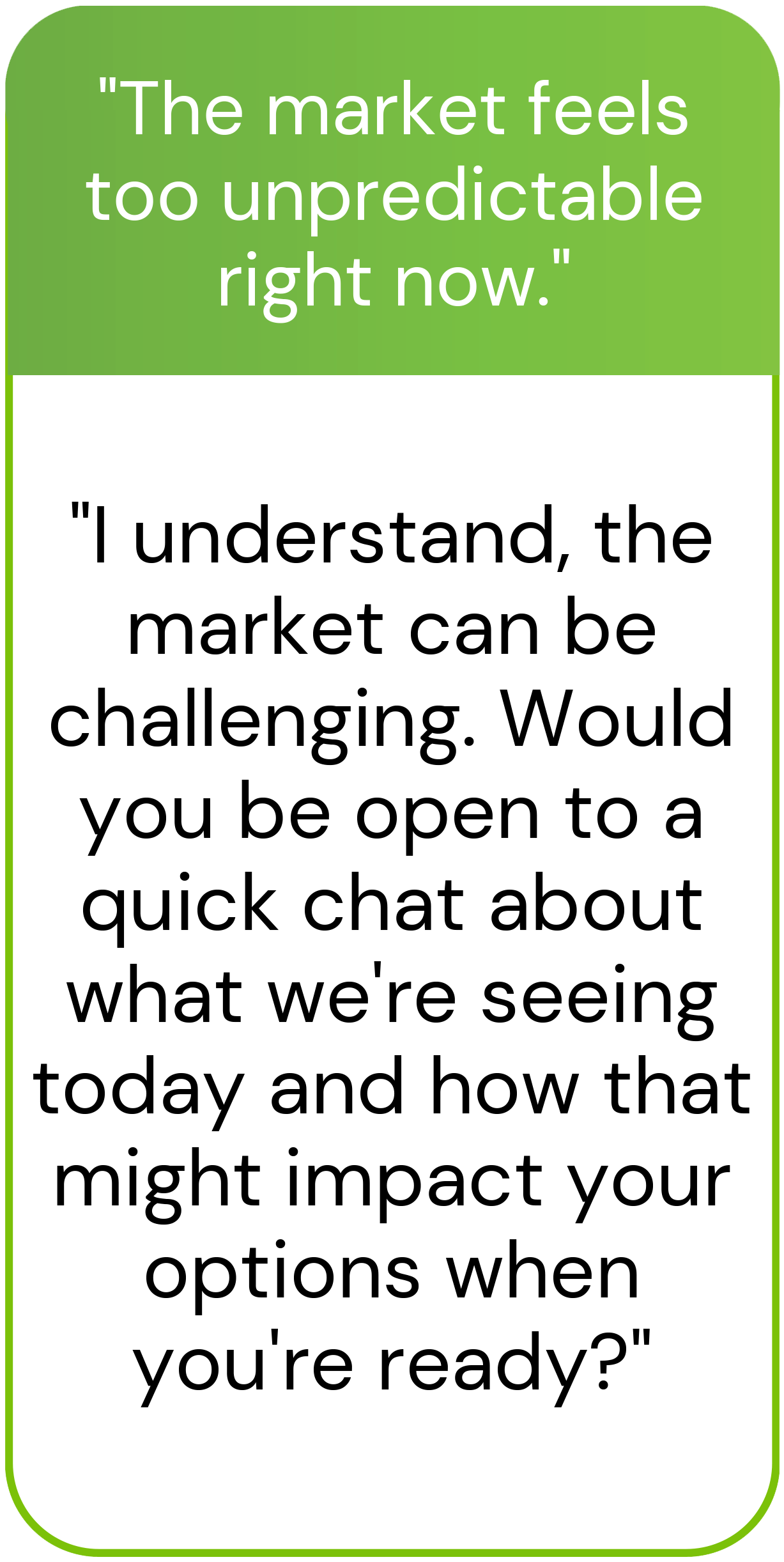 Hi %contact_first_name%, hope your day’s going smoothly. Just wanted to keep my promise to reach out. There have been some changes in the house market this past week that I’m not sure is being talked about yet. I’ll call again tomorrow, what time works for you? If texting’s easier, let me know.