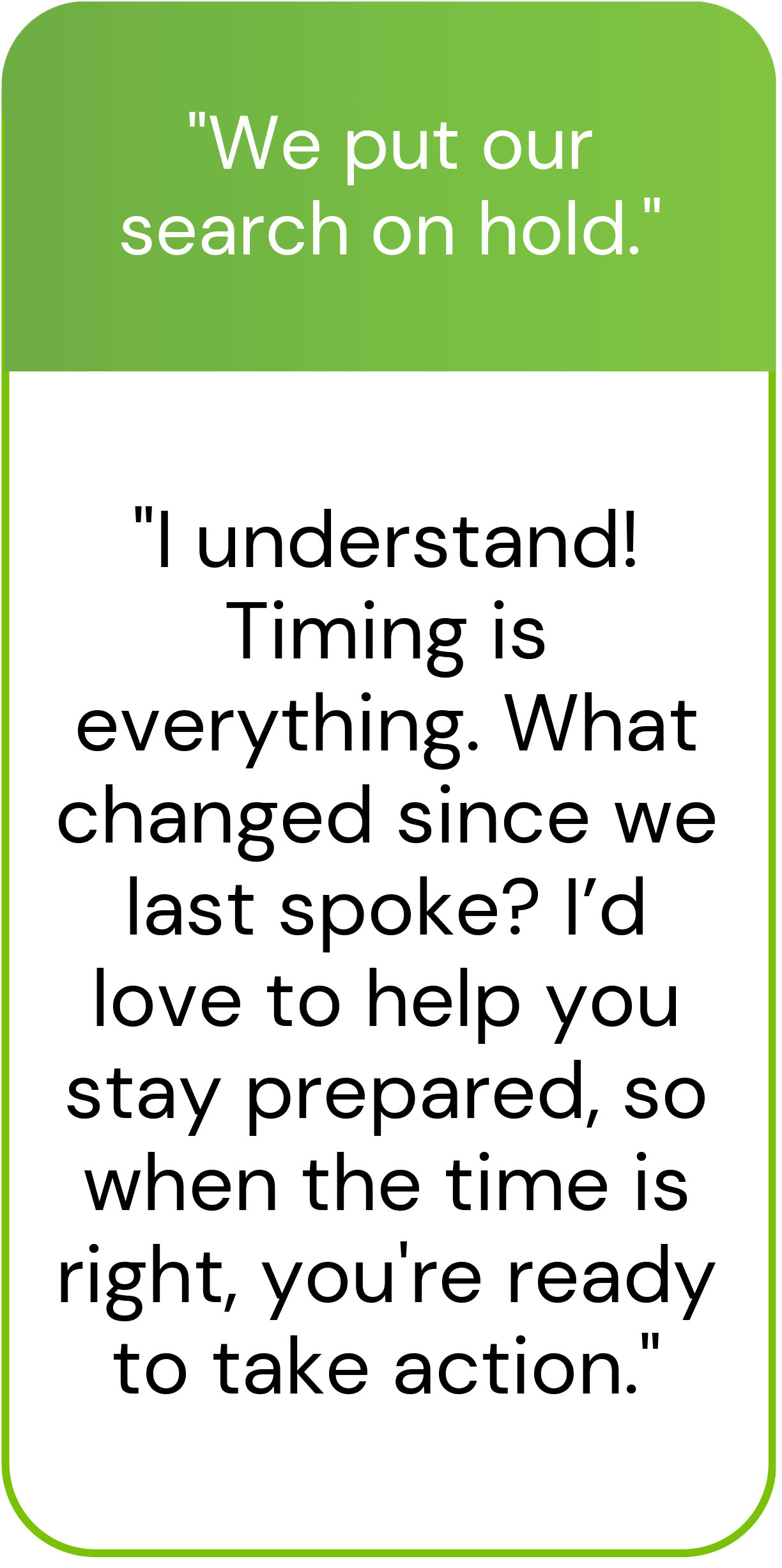 Hi %contact_first_name%, hope you’re day’s going well! Just keeping my promise and checking in. Just wanted to let you know that I’m going to put you down here as not available. I’ll still reach out every now and then by email/text to keep you updated on the market but until I hear from you I’m going to assume you aren’t ready to look at moving just yet. That’s very normal, and absolutely okay. I’ll be here for you when you’re ready, I promise.